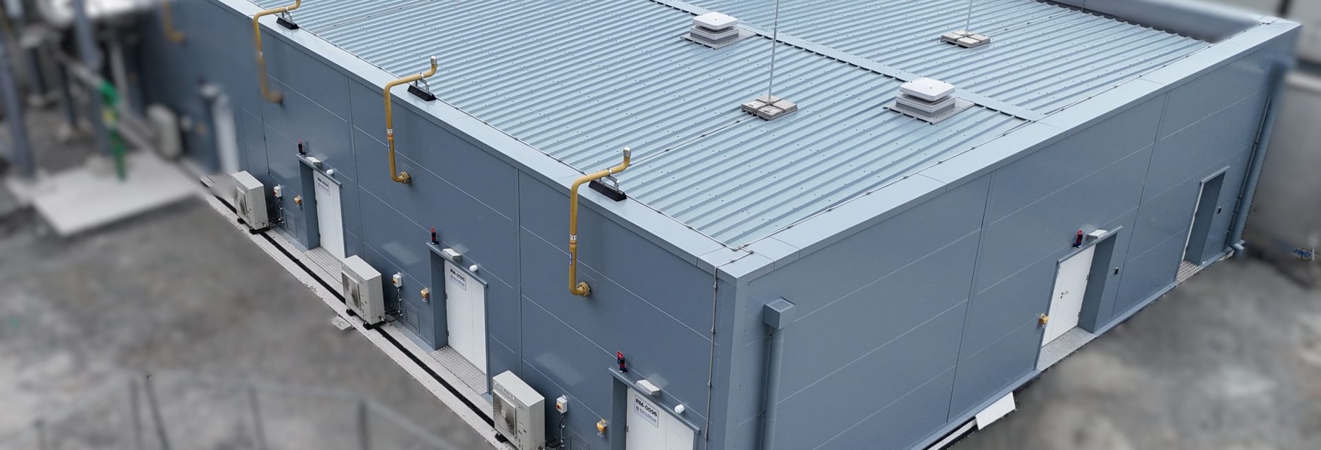 Fully modularized off site at BAF manufacturing facilities. Four fully independent R717 Ammonia chiller & heatpump modules with integrated gas detection, extract, air conditioning, controls, and instrumentation.